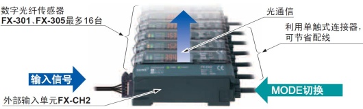 無需對傳感器本體進行操作,利用PLC·可編程智能操作面板和按鈕等外部信號即可一次性地對最多16臺數字光纖傳感器進行各種設定/切換。
